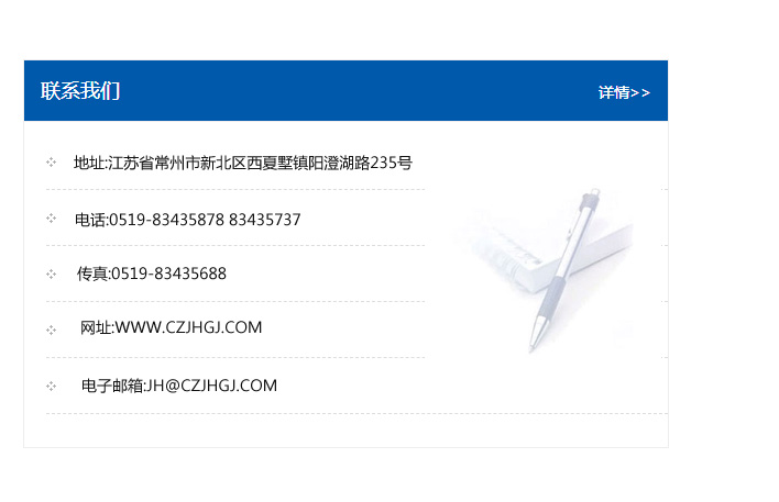 地址:常州市新北區友邦商務大廈1幢16、17層  電話:0519-85101652  傳真:0519-85112595  郵編:213022  網址:www.cz-jiayue_cn.hotmst-tip.com  郵箱:xiajifengaa@163.com